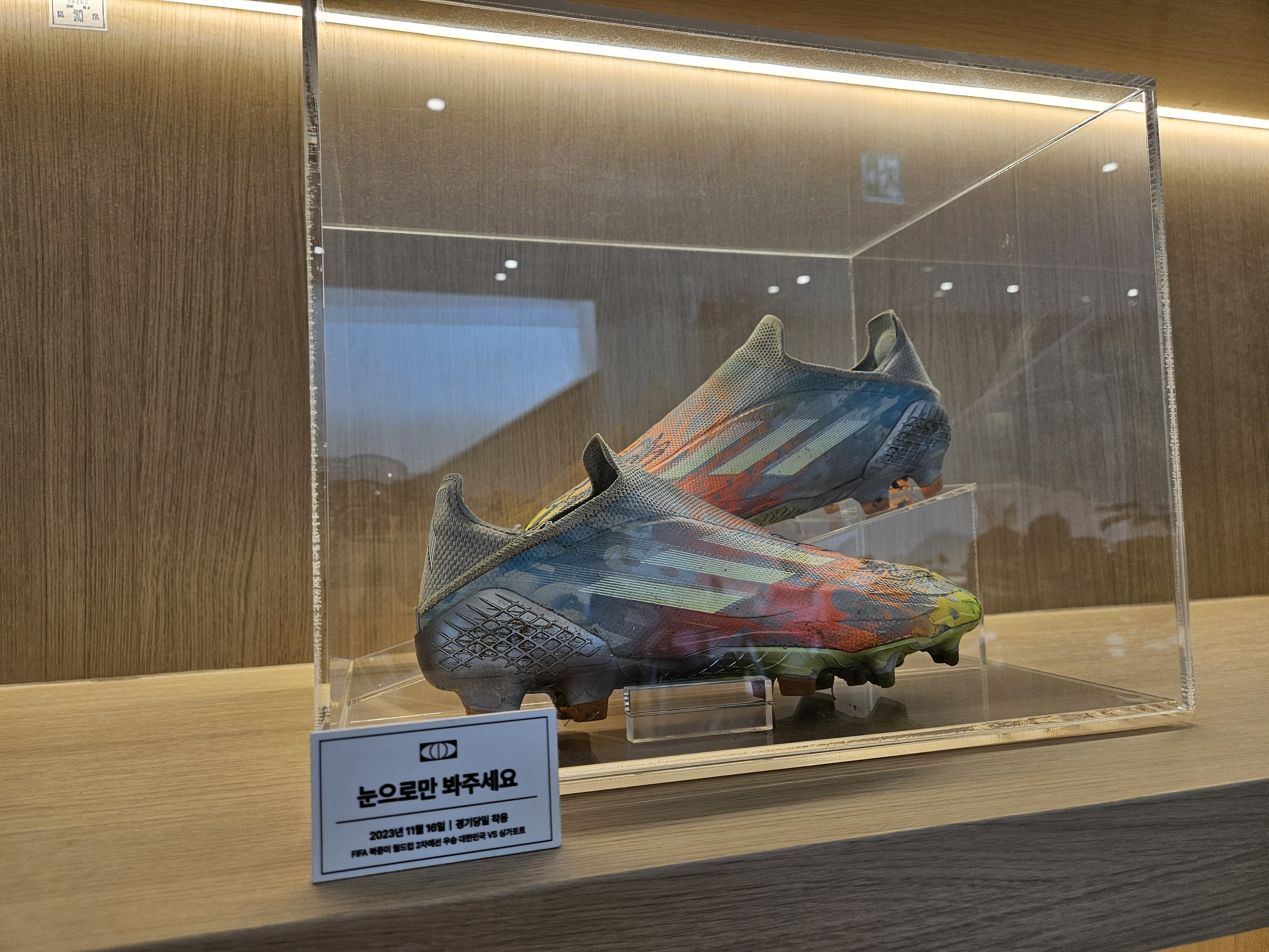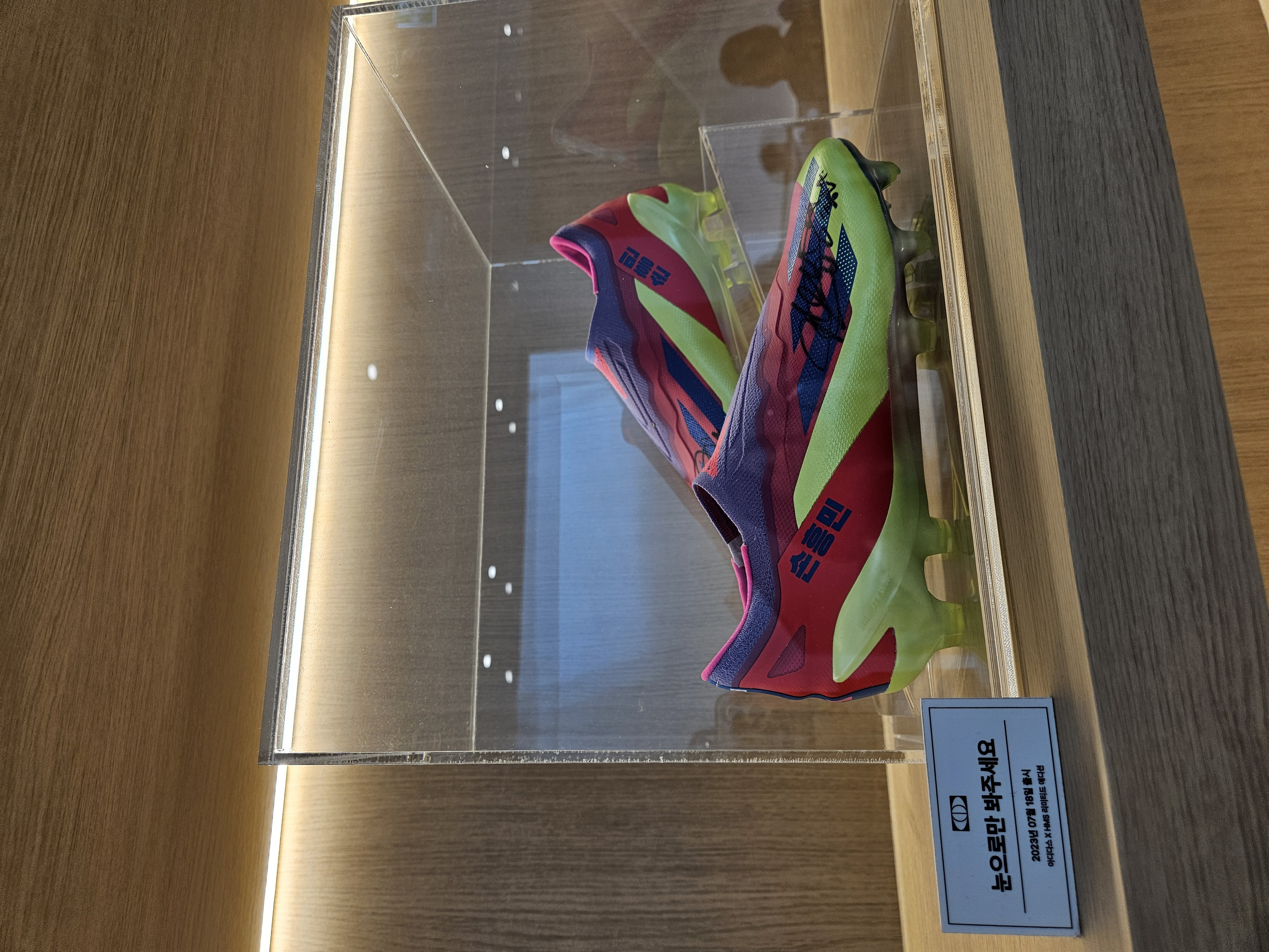 손흥민 축구화들을 구경할 수 있었어요 실제로 착용한 축구화라 신기하게 봤어요