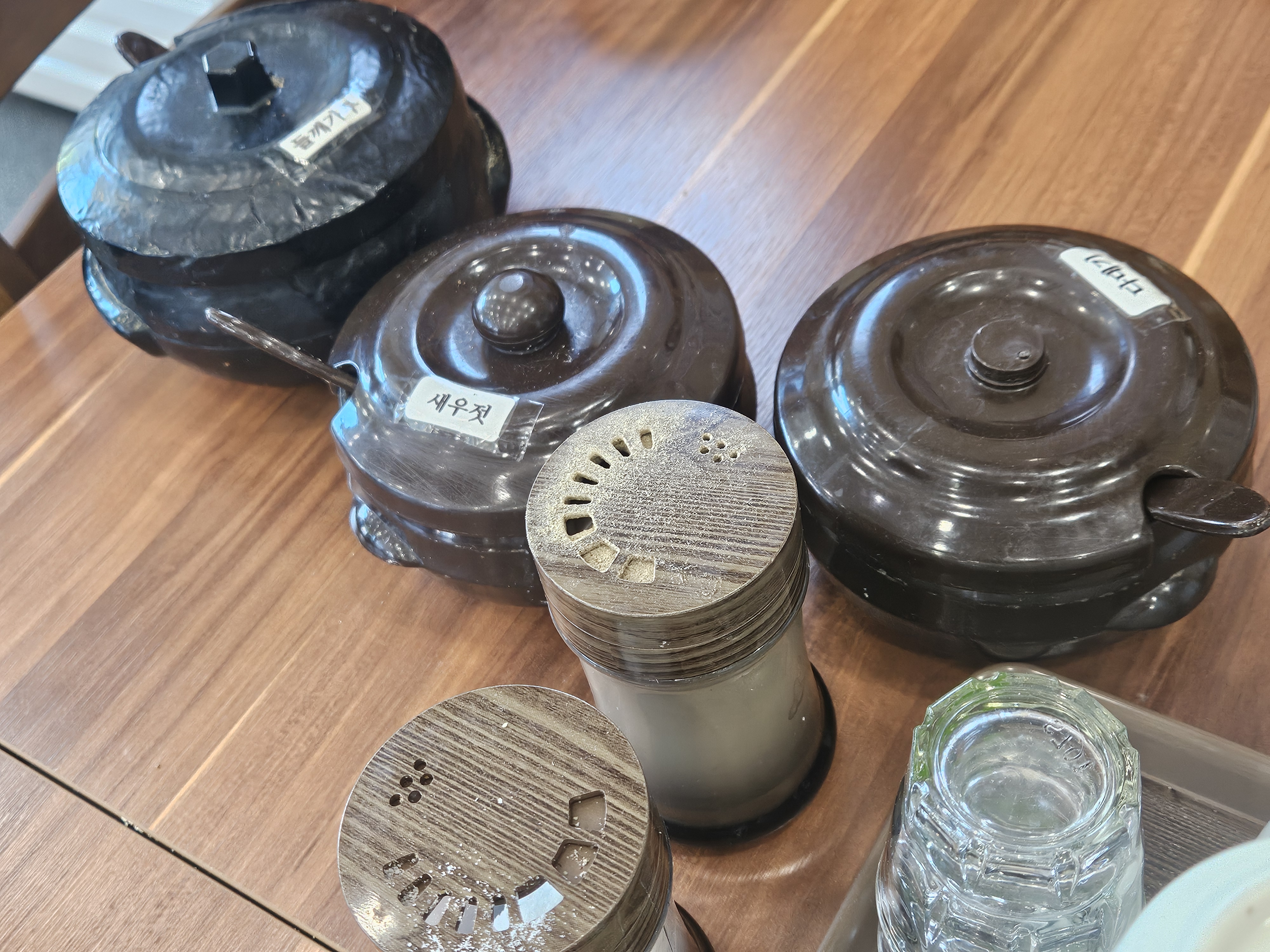 테이블에는 들깨가루, 새우젓, 다대기, 후추, 소금이 준비되어 있었어요
