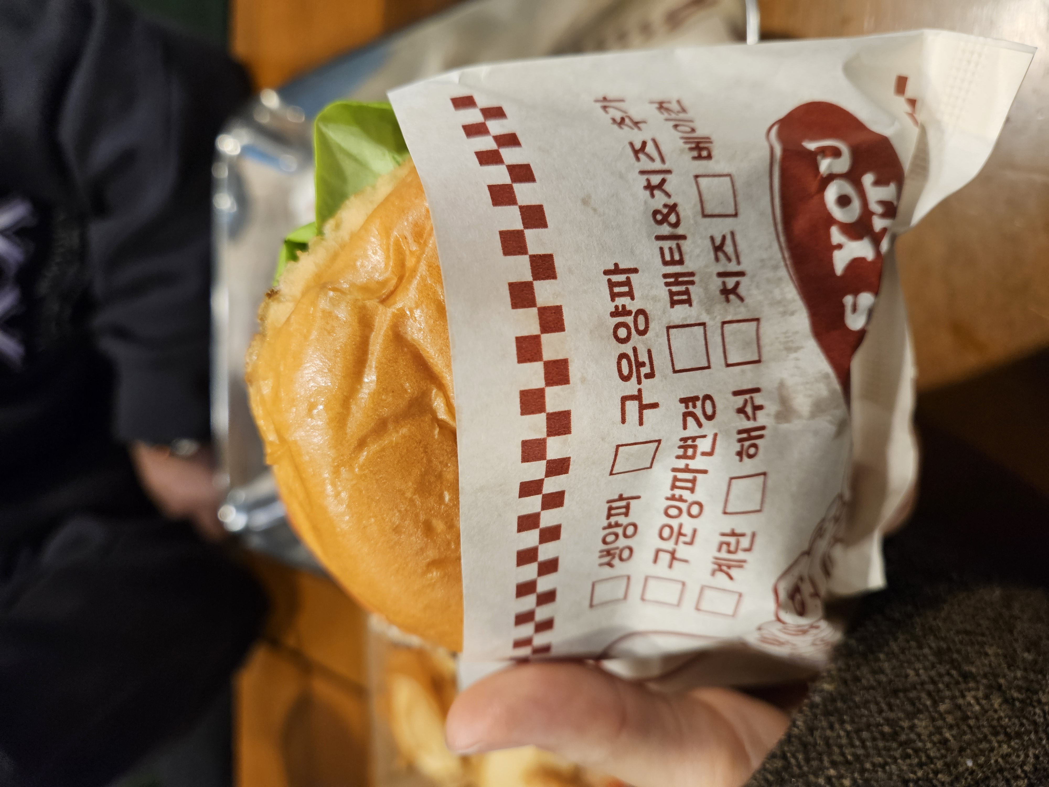 햄버거 포장지에 기호에 맞게 주문한 거 확인하면 됩니다!