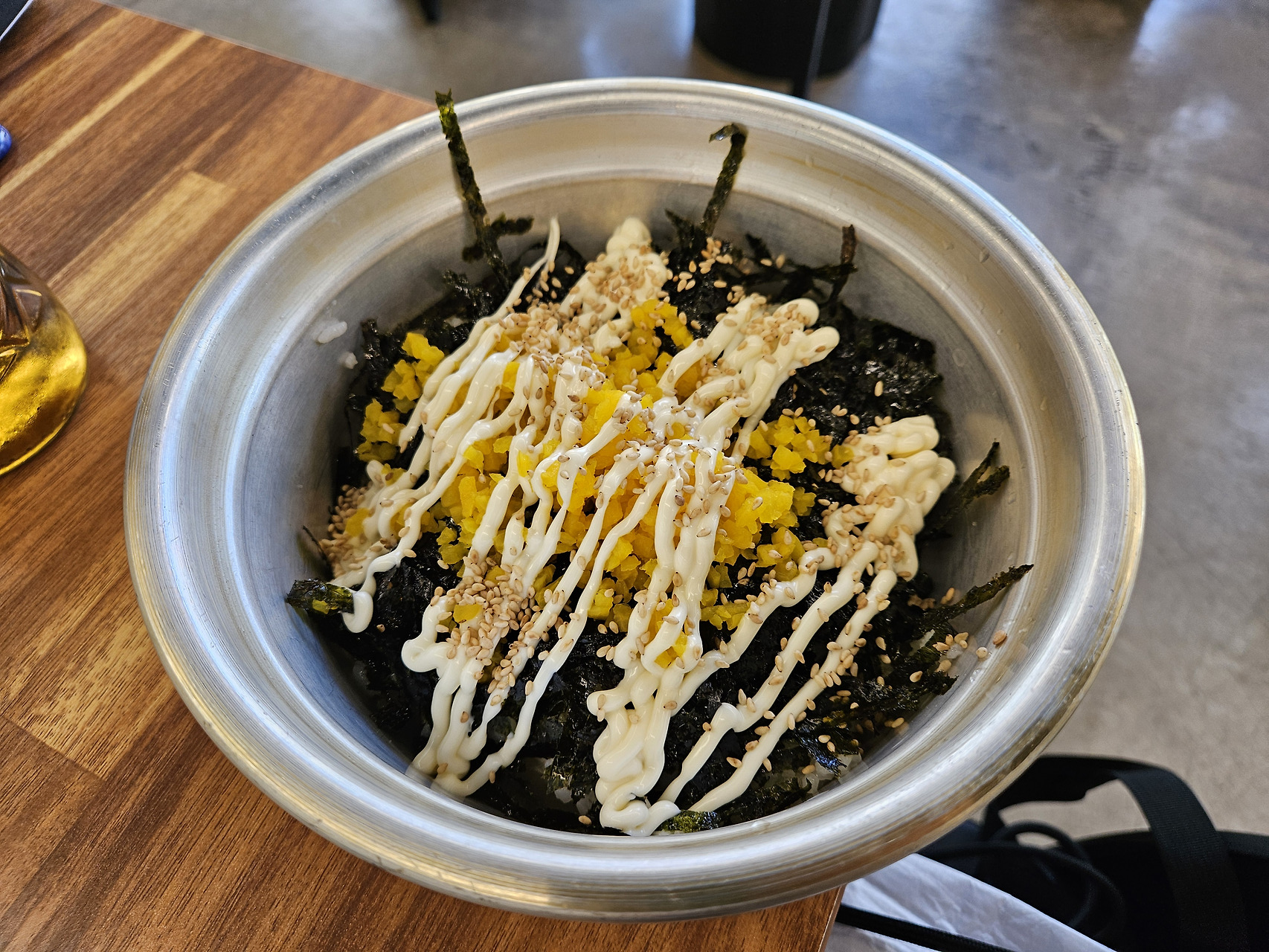 김가루, 단무지, 마요네즈가 듬뿍 뿌려져 있었어요
