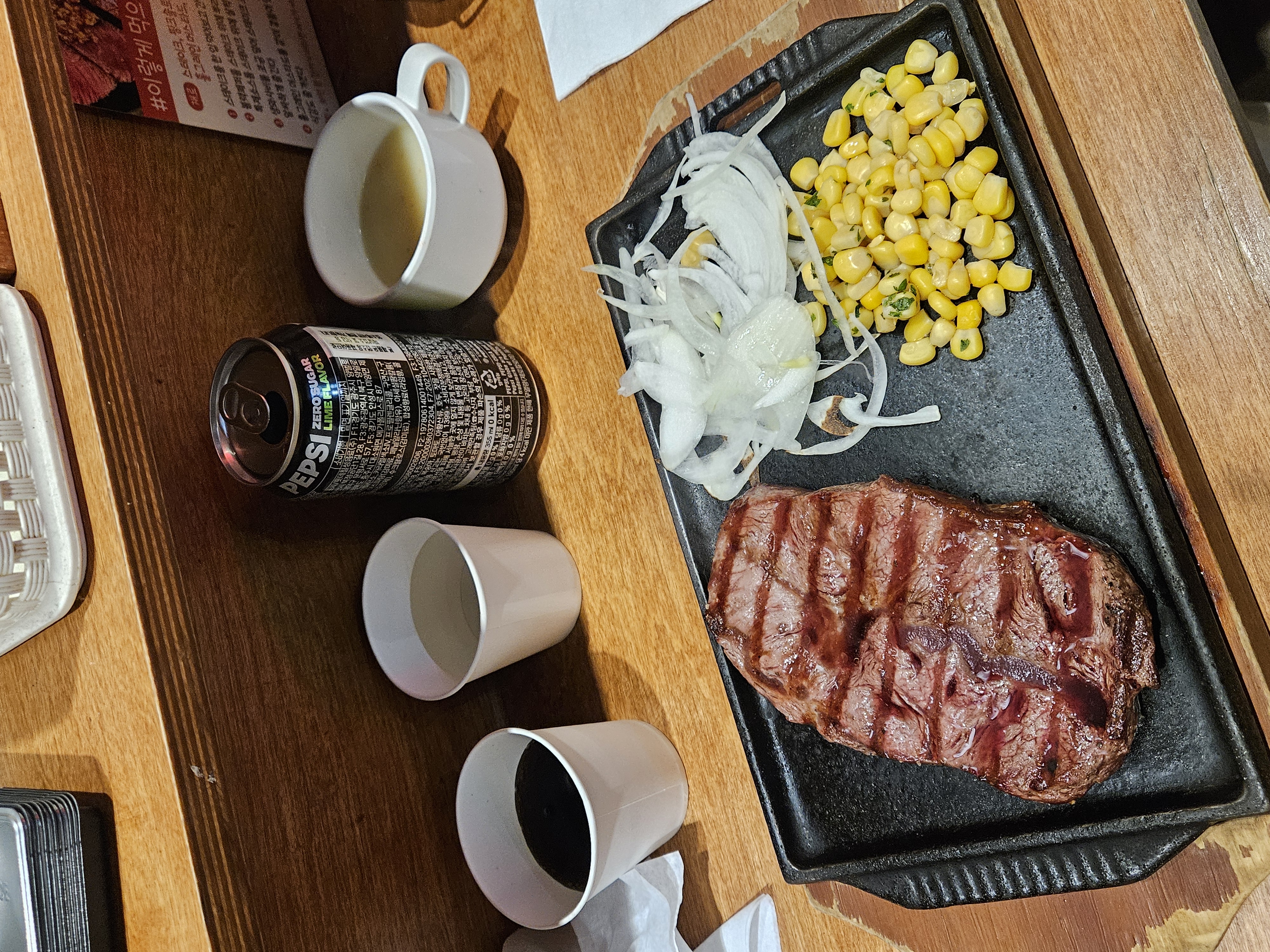 스테이크가 나왔고 양파와 옥수수콘도 함께 나왔습니다