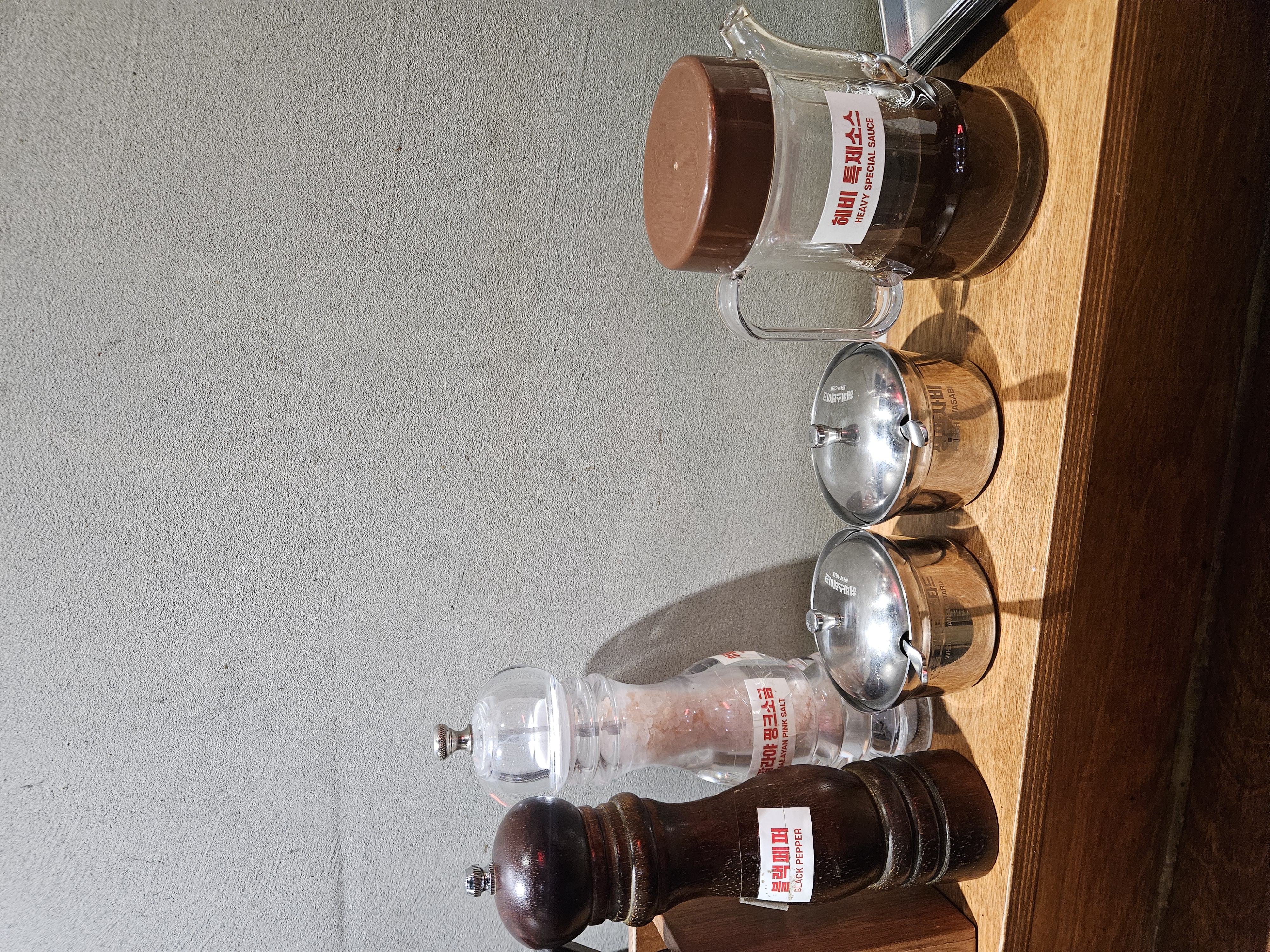 각 자리마다 포크와 나이프, 소금과 후추, 홀그레인 소스, 고추냉이, 특제소스 등 각종 소스들이 준비되어 있습니다