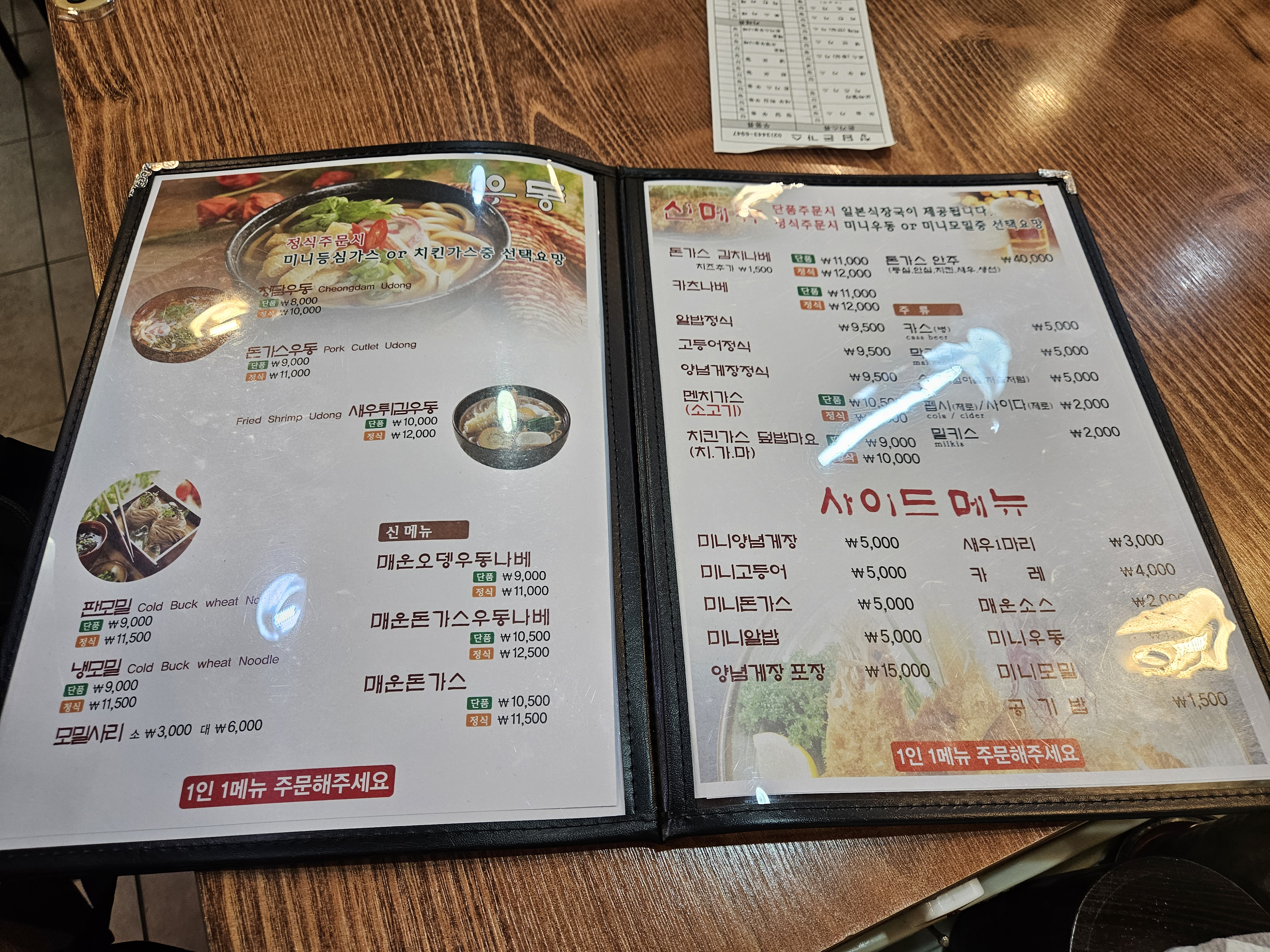 우동 or 메밀 선택할 수 있고, 돈가스와 김치전이 나왔어요