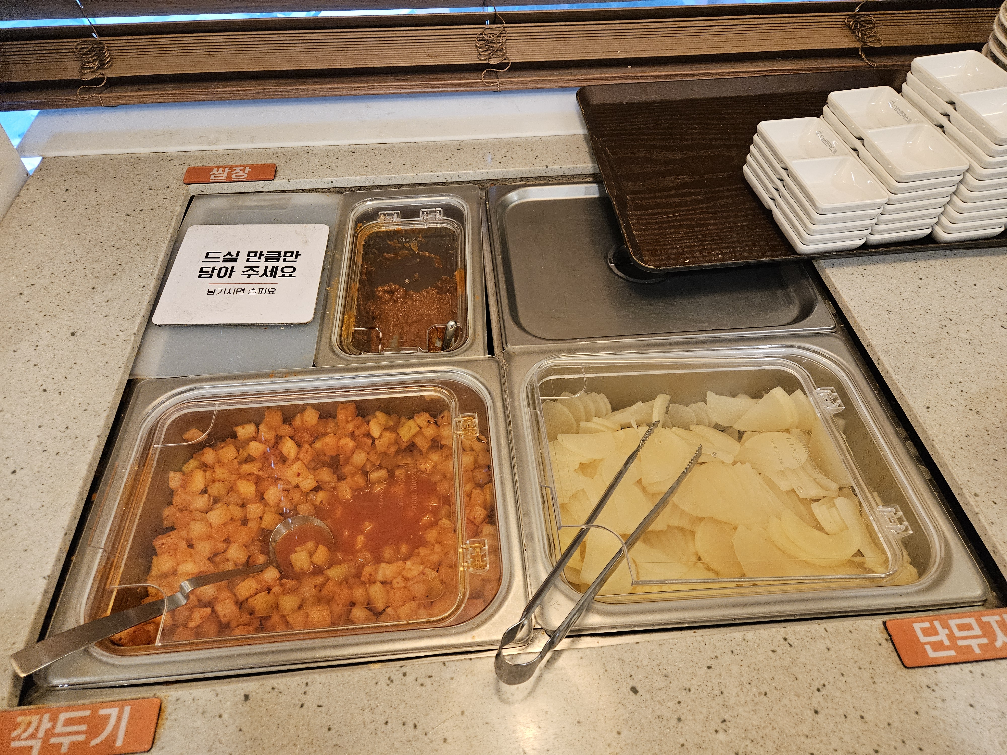 셀프바에는 깍두기와 단무지, 쌈장, 스프가 있었어요