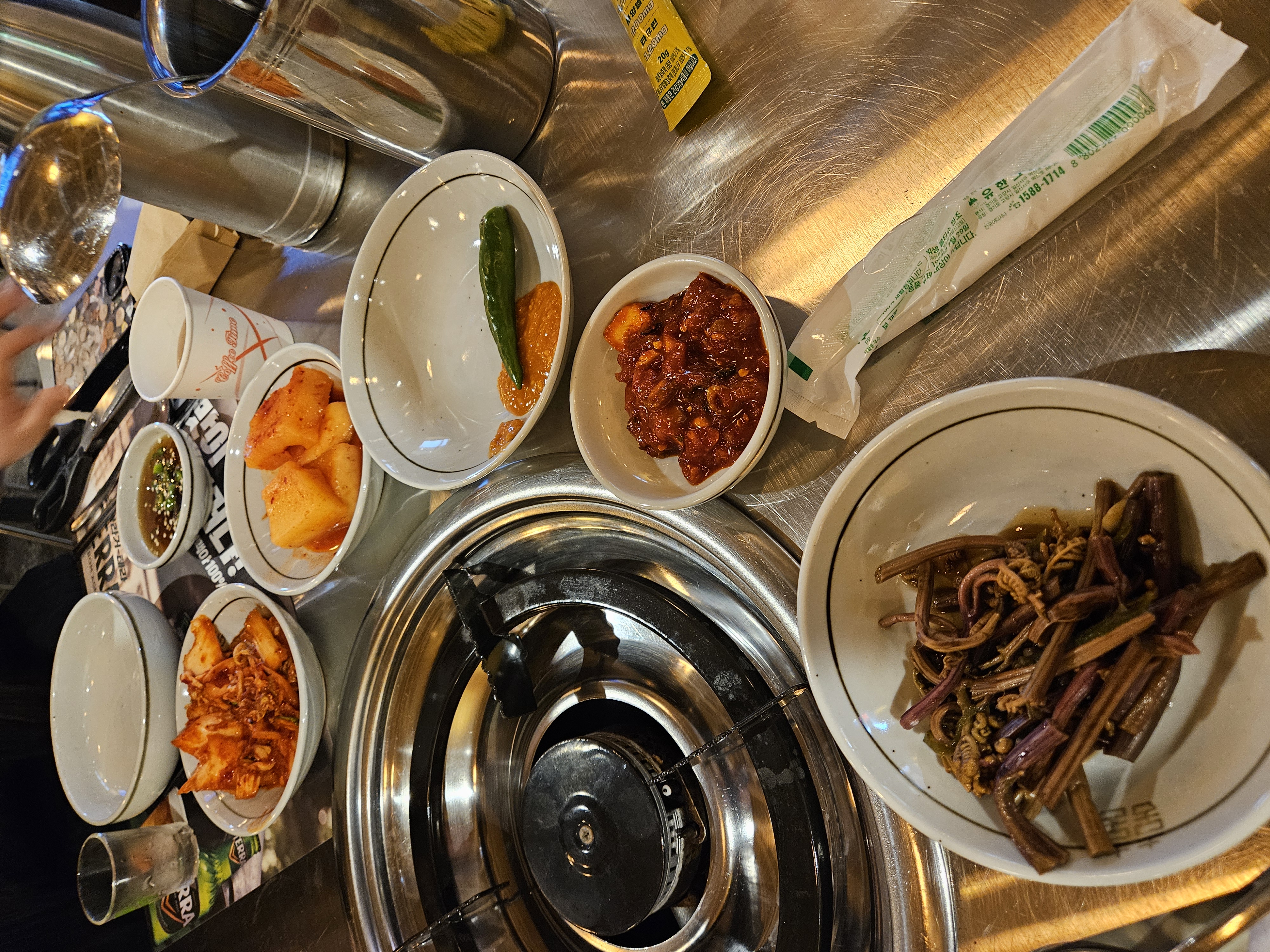 전골과 함께 먹는 간장 소스, 젓갈, 고추와 쌈장, 고사리, 각종 김치, 깻잎 장아찌 등