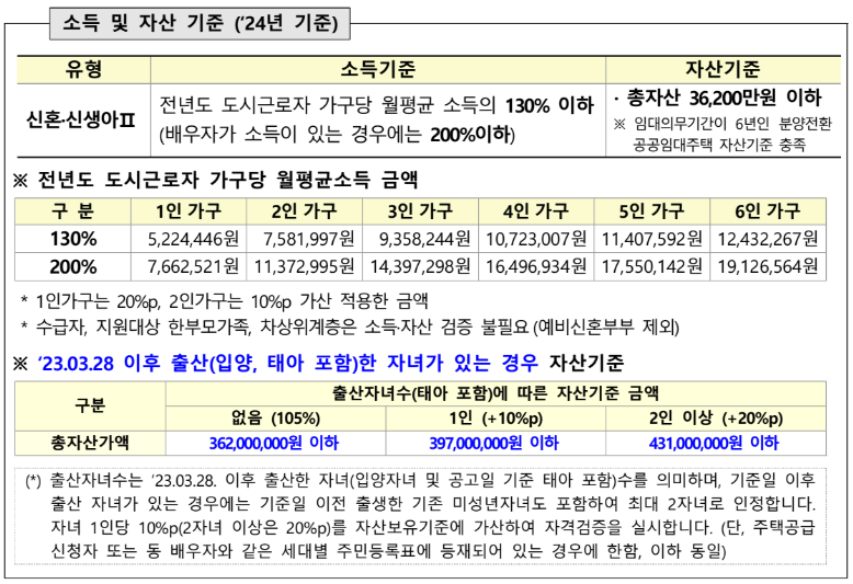 • 대상: 모집공고일 현재(2025.02.10) 무주택세대구성원으로서 신혼, 신생아 매입임대주택Ⅱ 소득 및 자산기준을 충족하고, 아래중 하나에 해당하는 자