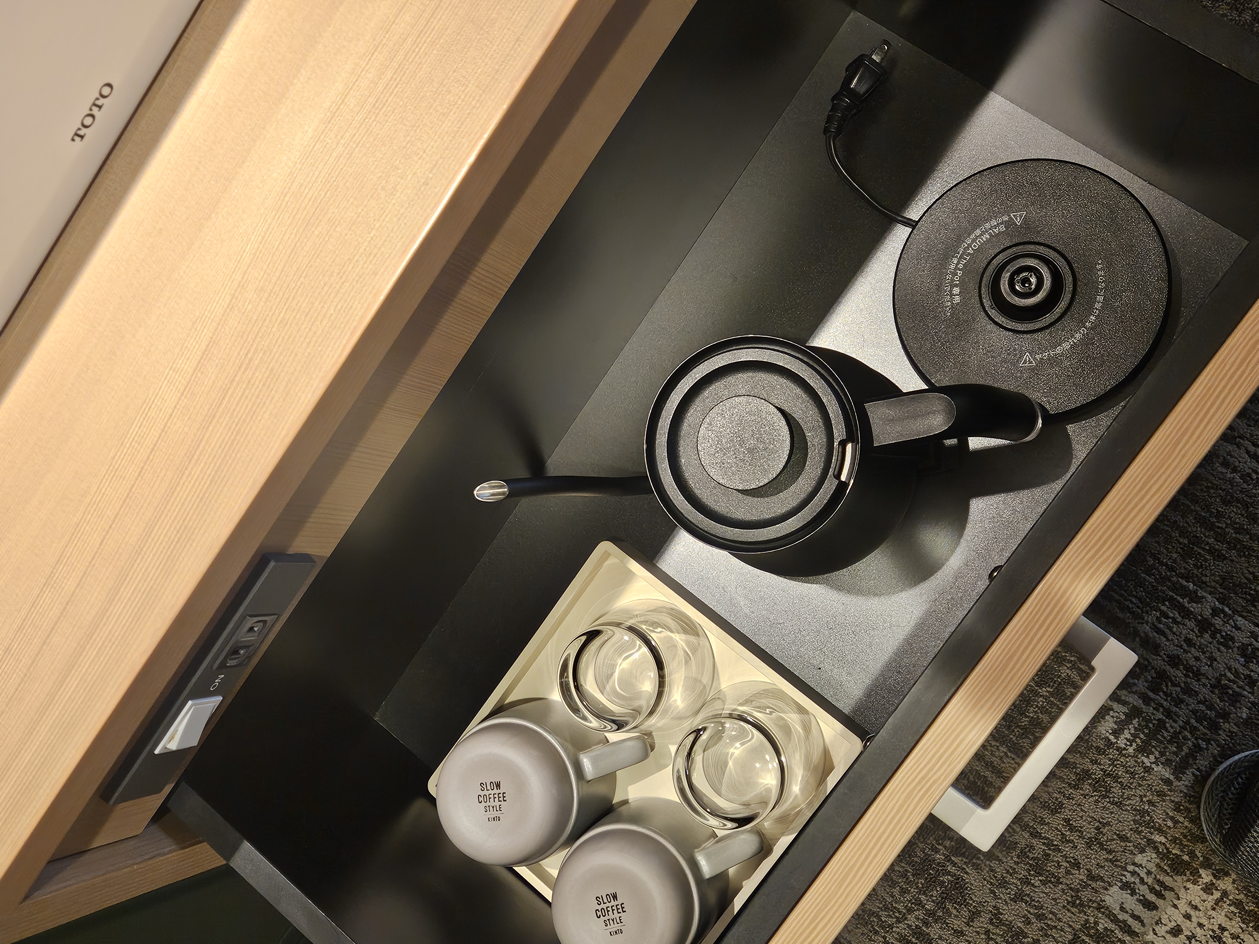 드라이기, 대욕장 갈 때 입는 옷, 컵, 전기포트가 준비되어 있습니다
