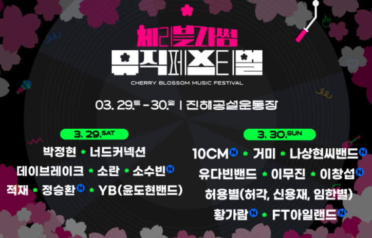 - 체리블라썸 뮤직 페스티벌: 03.29(토) ~ 03.30(일) 20:00~21:00 진해공설운동장에서 진행됩니다. 알앤비와 발라드 그리고 밴드 음악까지 즐길 수 있는 뮤직 페스티벌입니다. 참여 가수는 아래와 같습니다