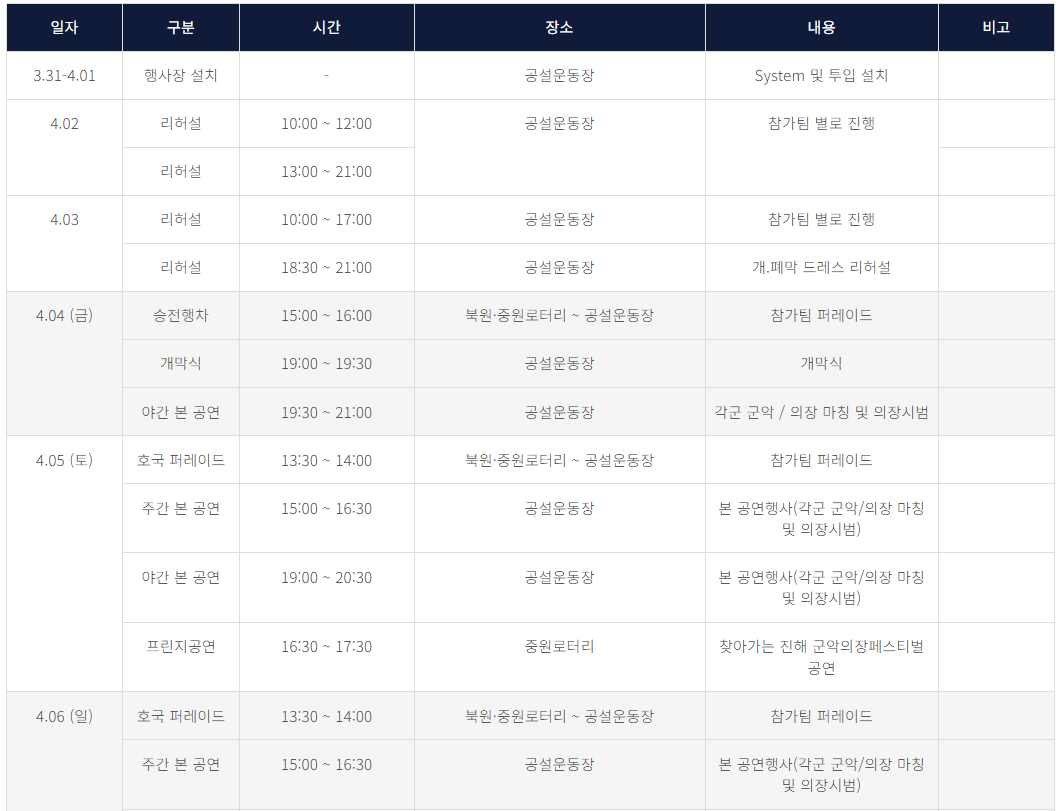 - 군항 K-POP 댄스 경연대회: 4월 2일(수) 17:00~20:00 중원로터리에서 진행됩니다. 전국의 춤꾼들의 댄스 경연대회입니다
