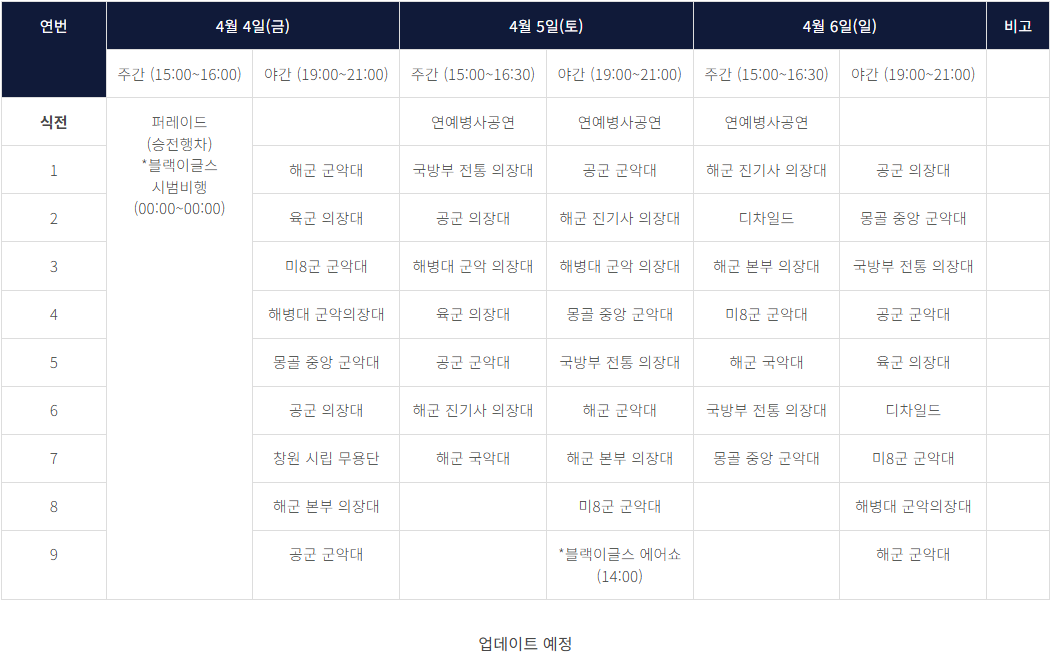 - 세계적인 군악의장 페스티벌 : 육·해·공군과 해병대, 미8군 군악대뿐만 아니라 몽골군악대까지 참가하는 퍼레이드가 열려, 웅장한 스케일의 공연을 감상할 수 있습니다. 특히 정교한 의장대 퍼포먼스는 매년 관광객들에게 큰 감동을 선사합니다.
