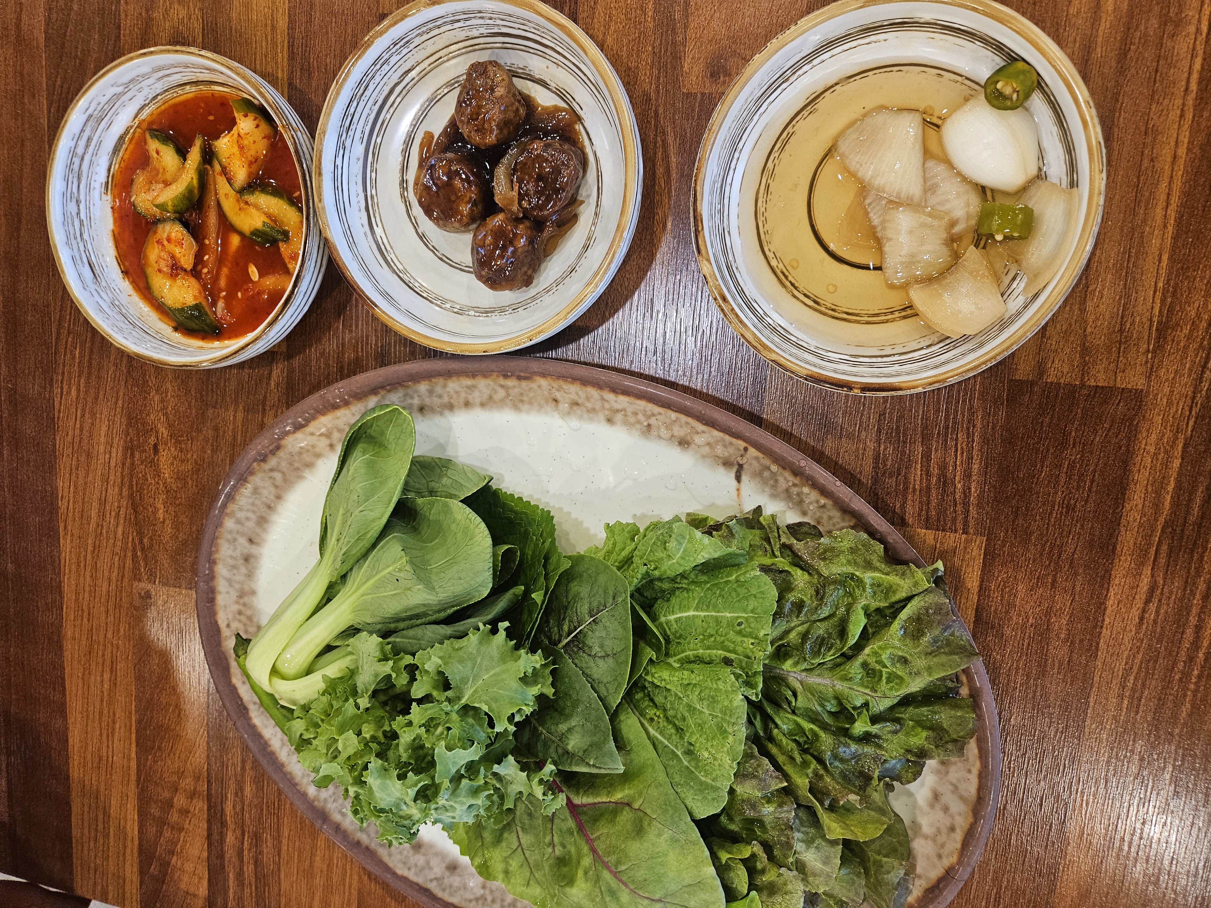유기농 쌈채소 종류도 다양하고, 오이, 미트볼, 양파 장아찌, 계란찜, 강된장, 고등어조림 등등
