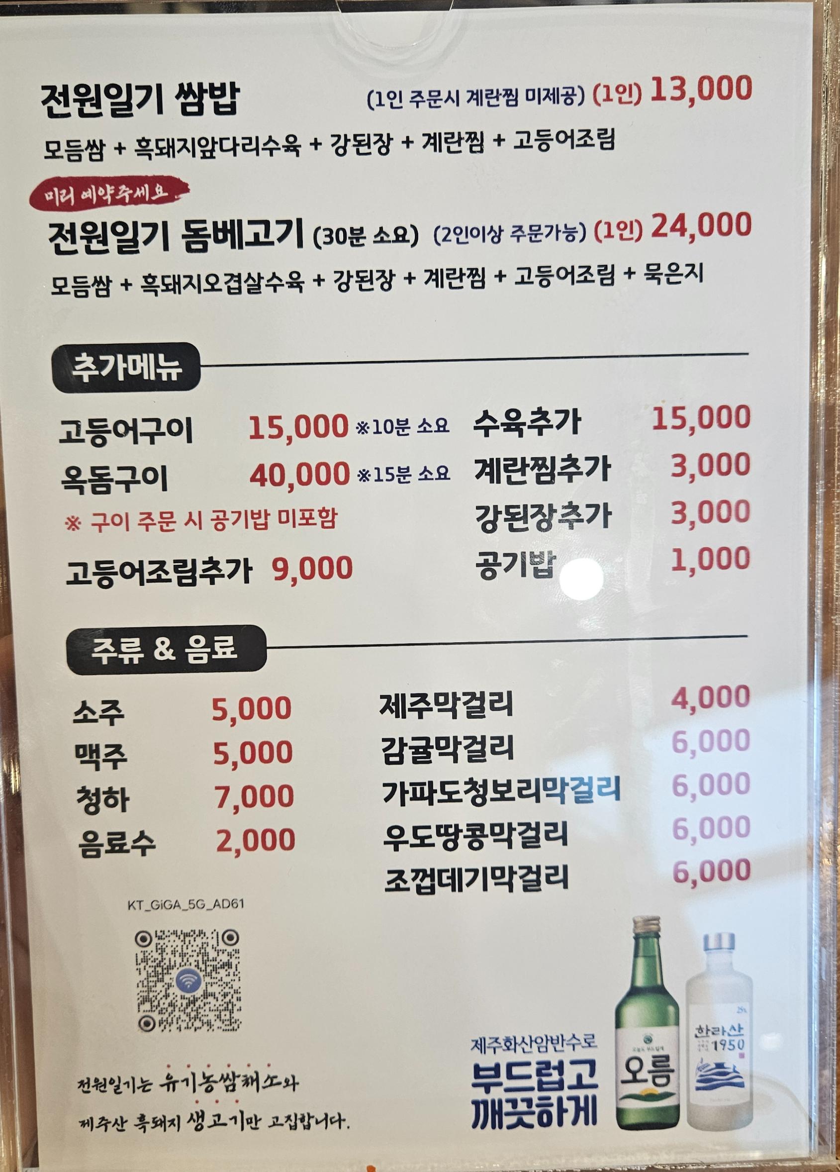 모둠쌈, 흑돼지 앞다리수육, 강된장, 계란찜, 고등어조림이 나오는데 이 가격이라니.... 제주도 가성비 맛집입니다