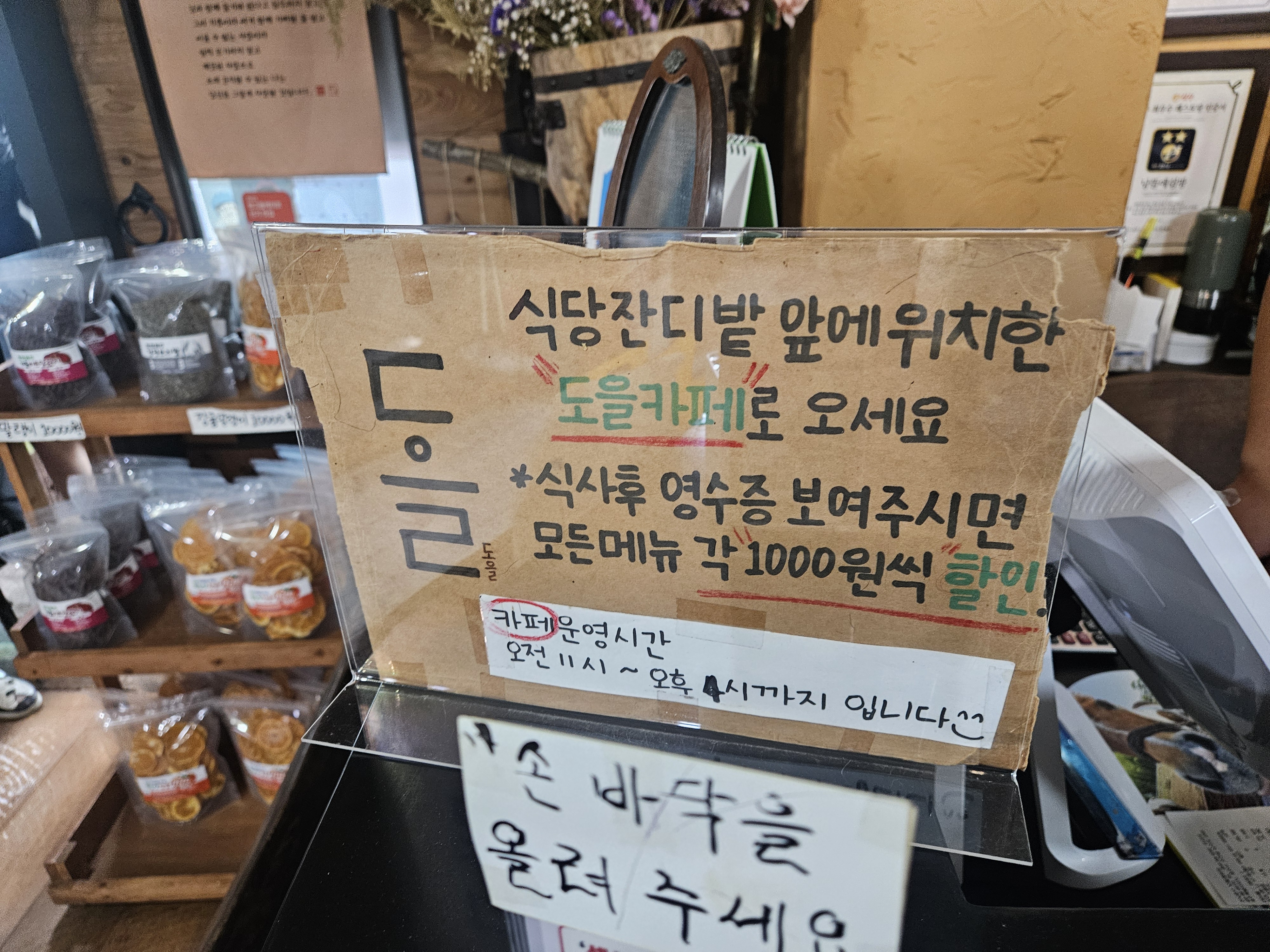 식사 후 카페를 가실 예정이시라면 '도을카페'를 방문하시면 1천 원 할인된 금액으로 이용할 수 있어요