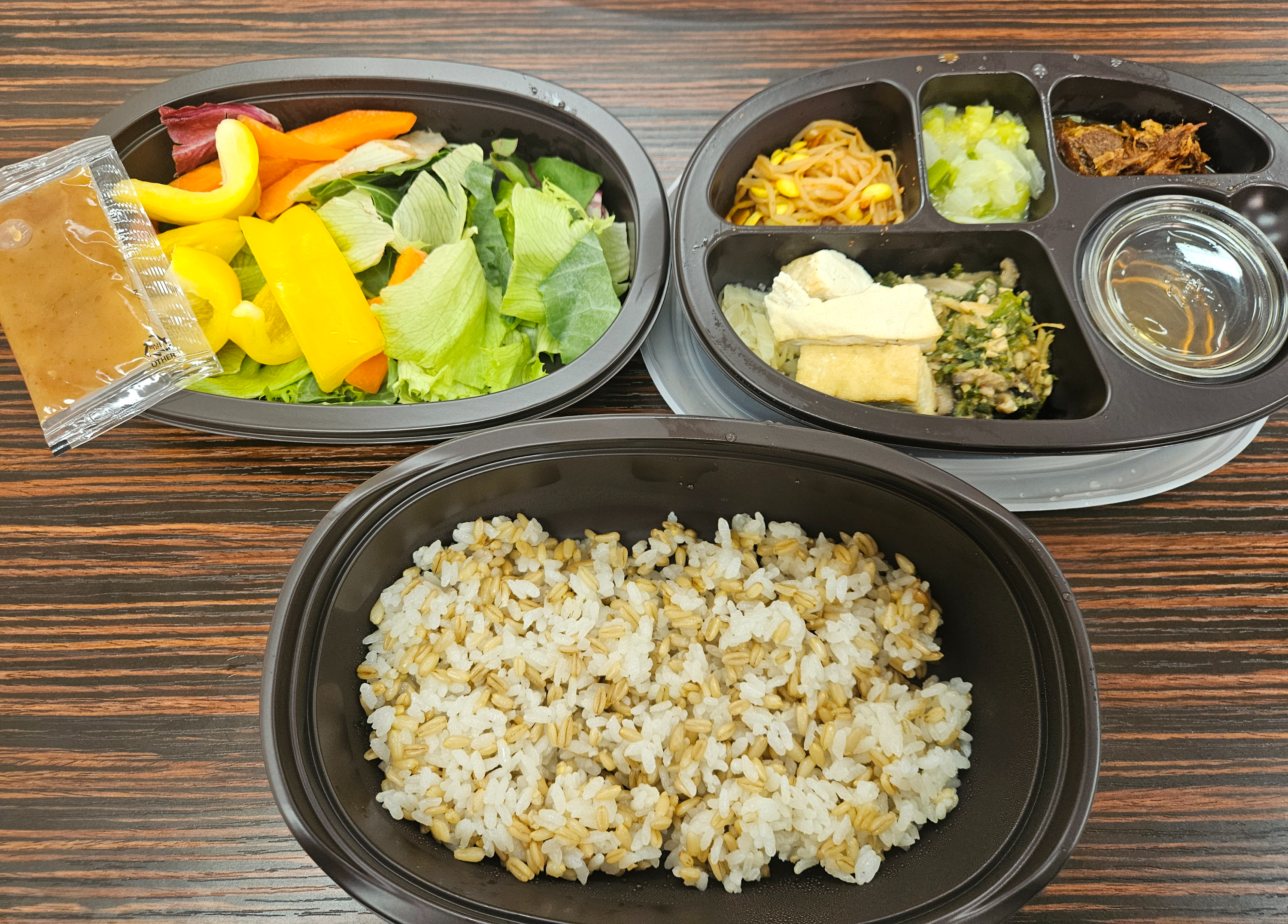 또한 애호박 볶음, 볶음김치, 데친 양배추와 함께 왔고, 발아현미밥이 나왔습니다~